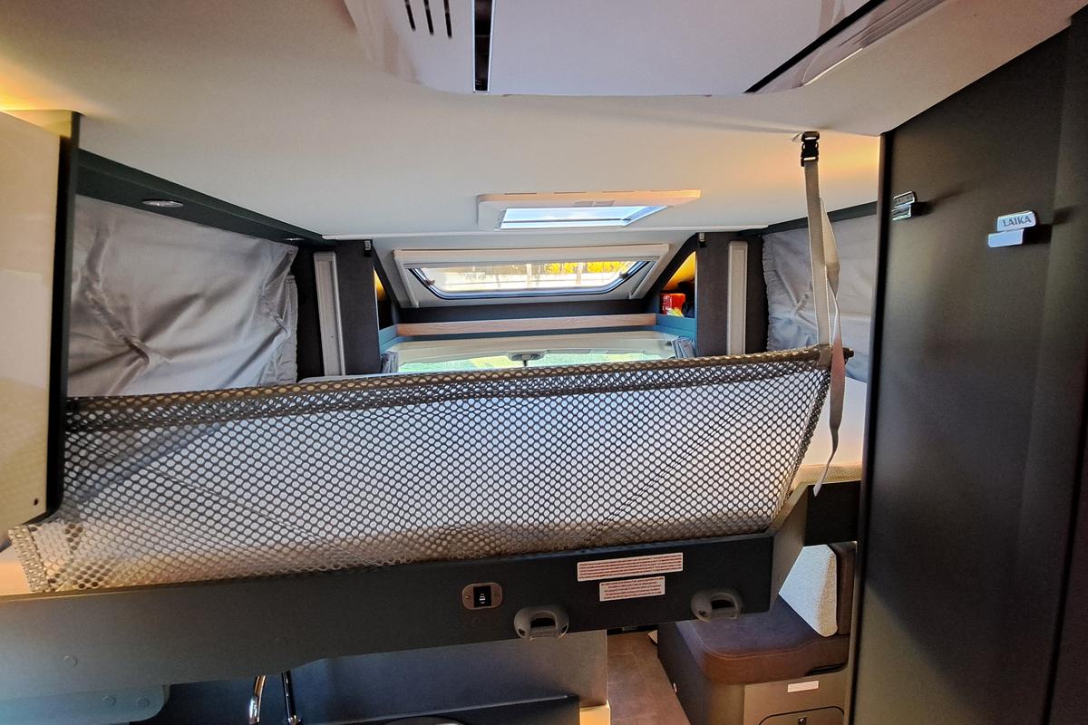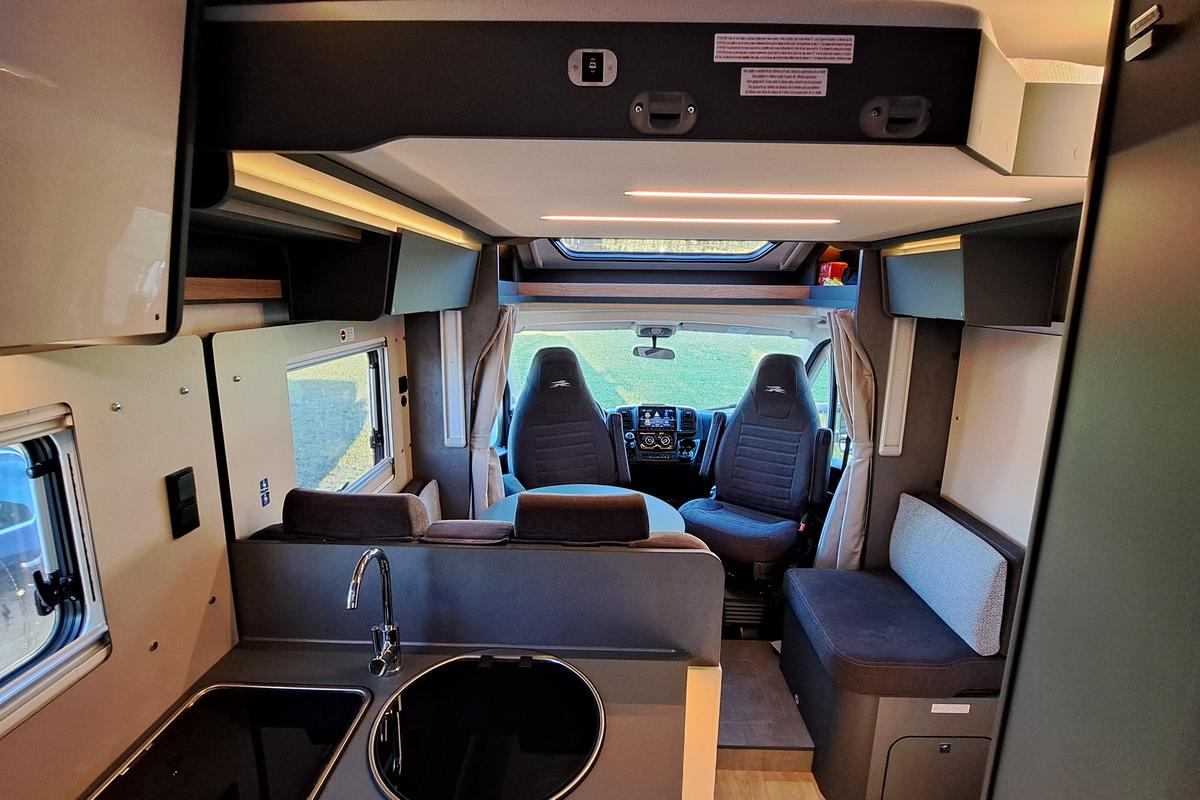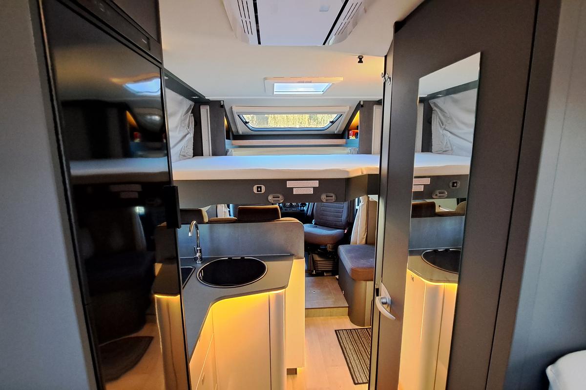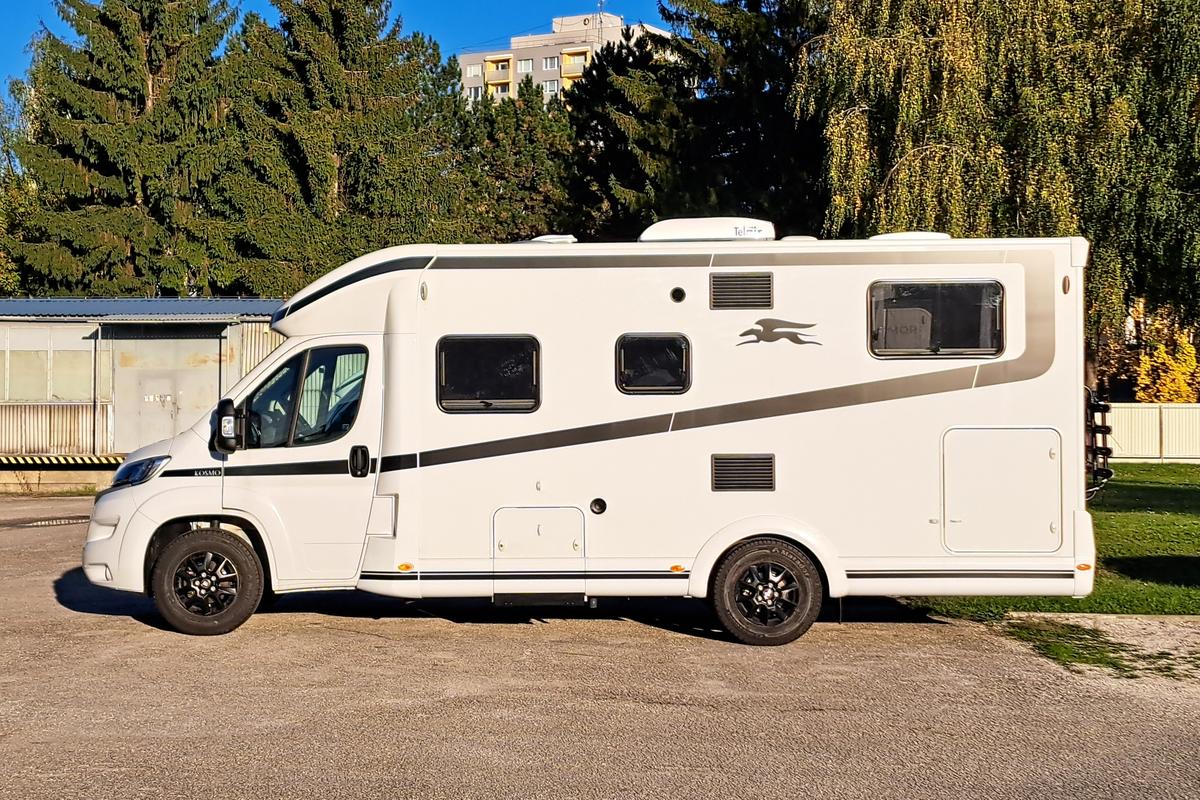 Obytné auto prémiovej triedy pre 4 / 4 osoby (cestovanie / spanie) s obľúbenou dispozíciou s pozdĺžnymi zadnými lôžkami a vpredu so spúšťacím dvoj-lôžkom.