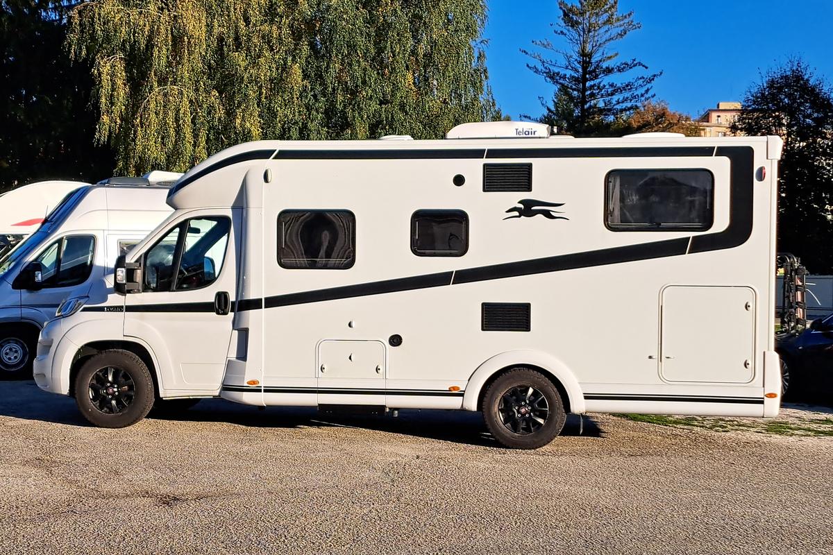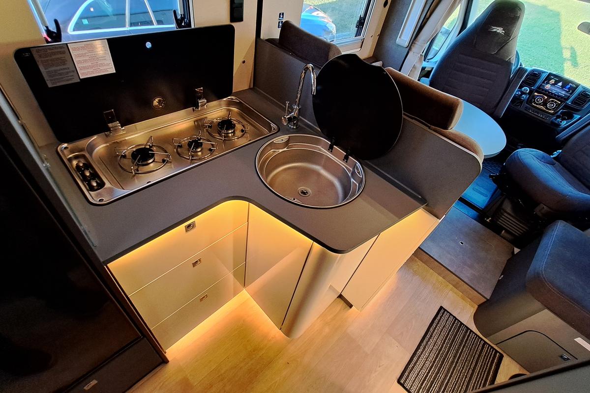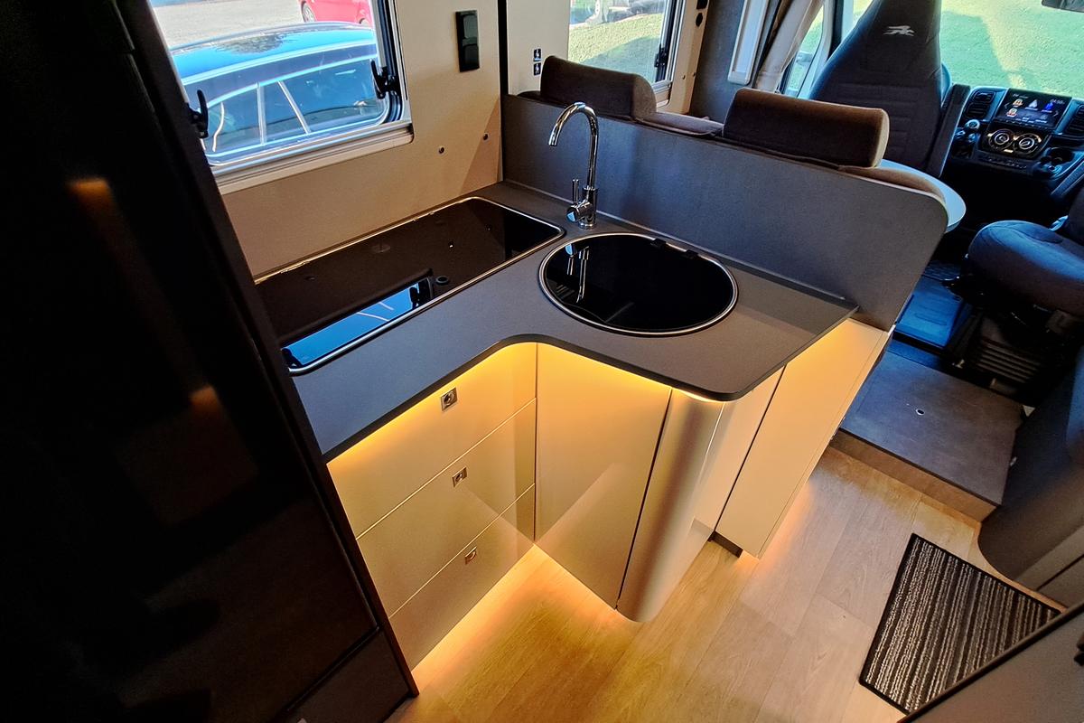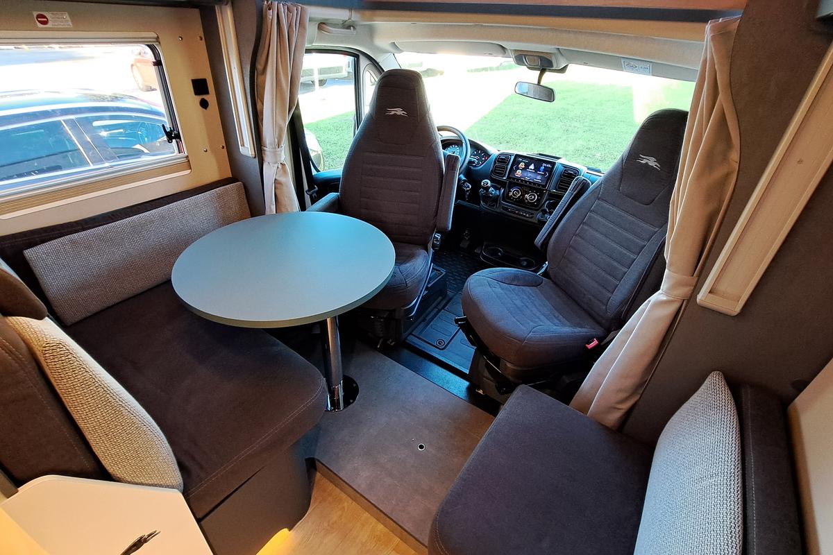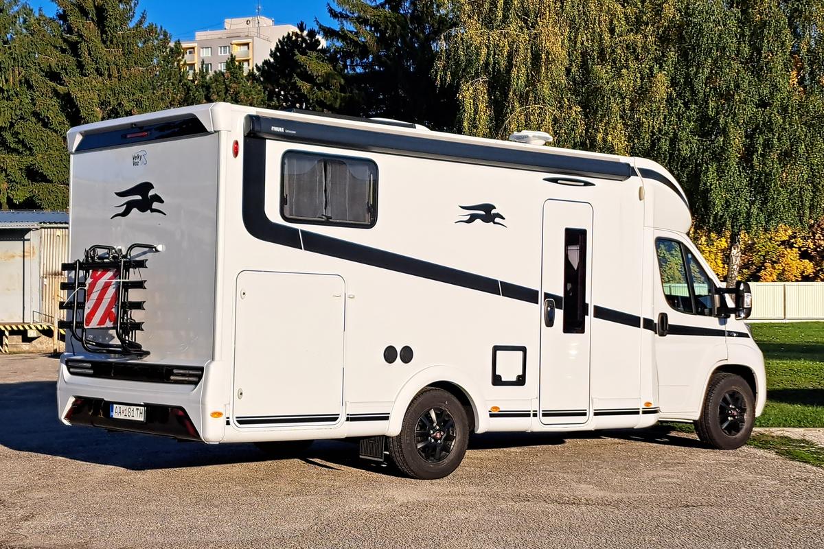 Obytné auto prémiovej triedy pre 4 / 4 osoby (cestovanie / spanie) s obľúbenou dispozíciou s pozdĺžnymi zadnými lôžkami a vpredu so spúšťacím dvoj-lôžkom.