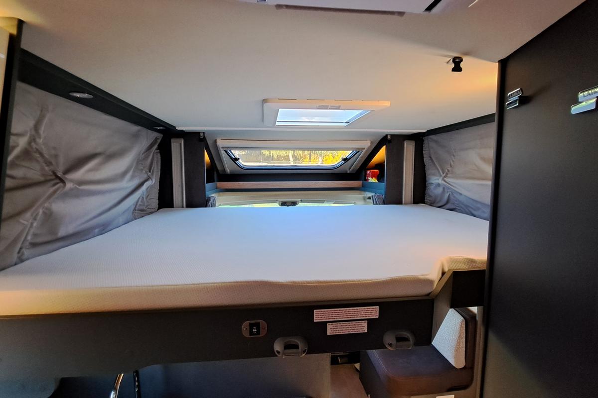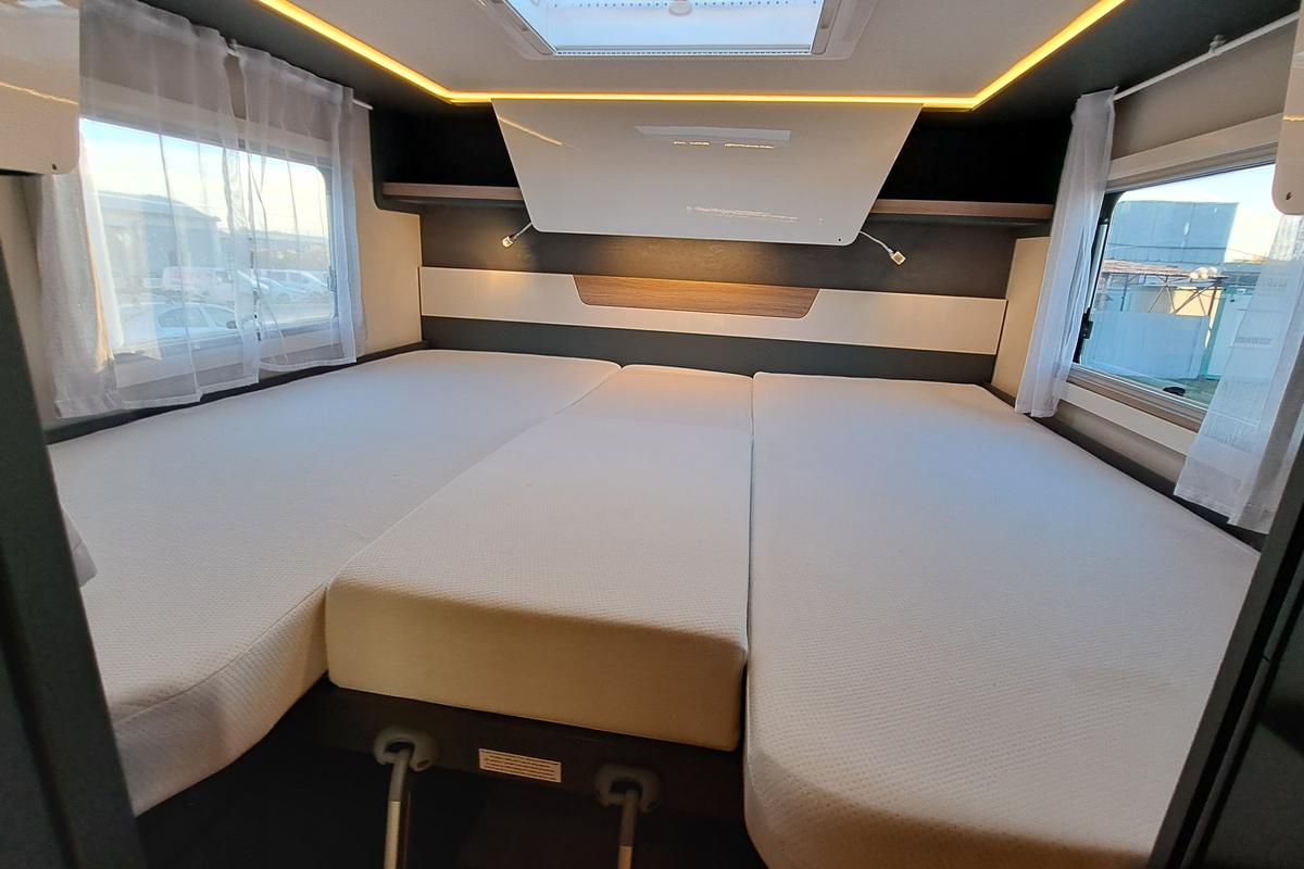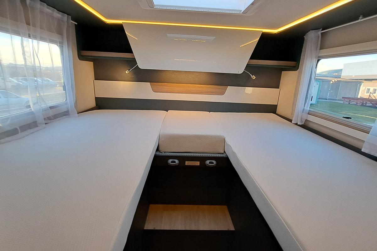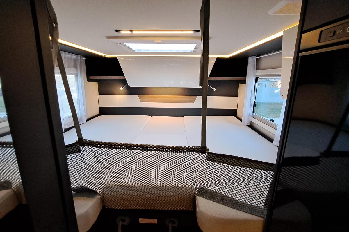 Dve zadné pevné samostatné lôžka 200 x 80 + 195 x 80 cm s rozkladaním na veľké „letisko“ 210 x 184 cm, predné spúšťacie dvoj-lôžko 200 x 140 / 123 cm s elektrickým zdvihom, lamelové rošty postelí, komfortné matrace so strečovou podšívkou, ktorá sa môže prať v práčke,