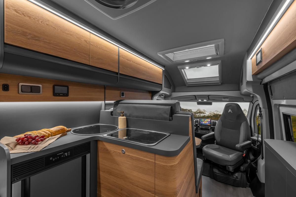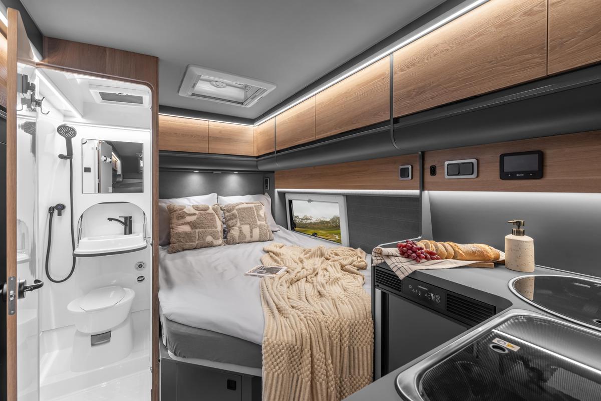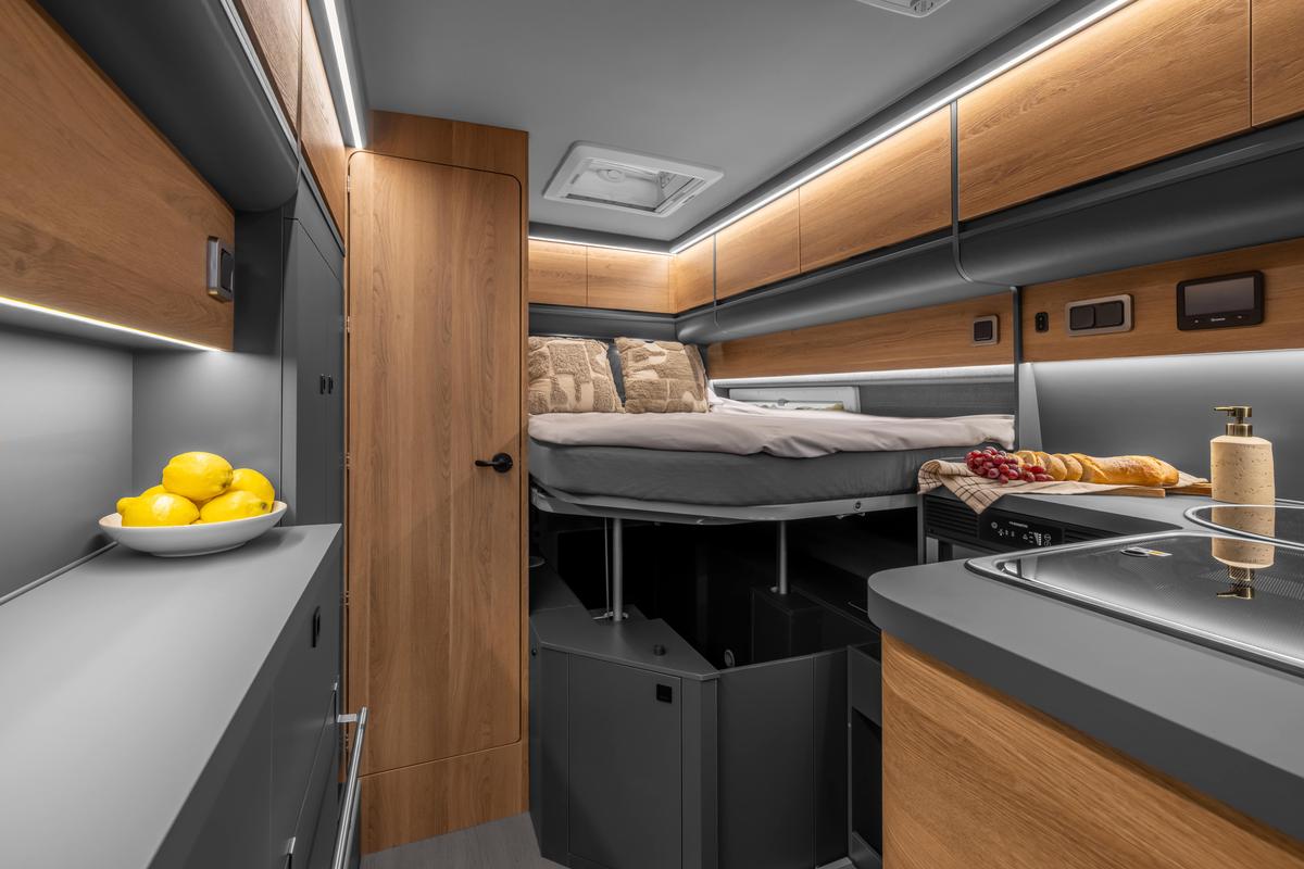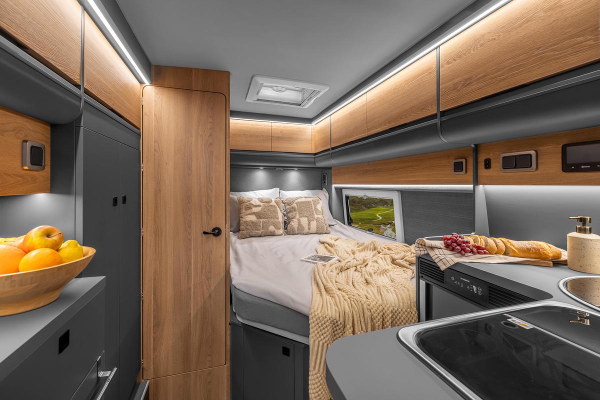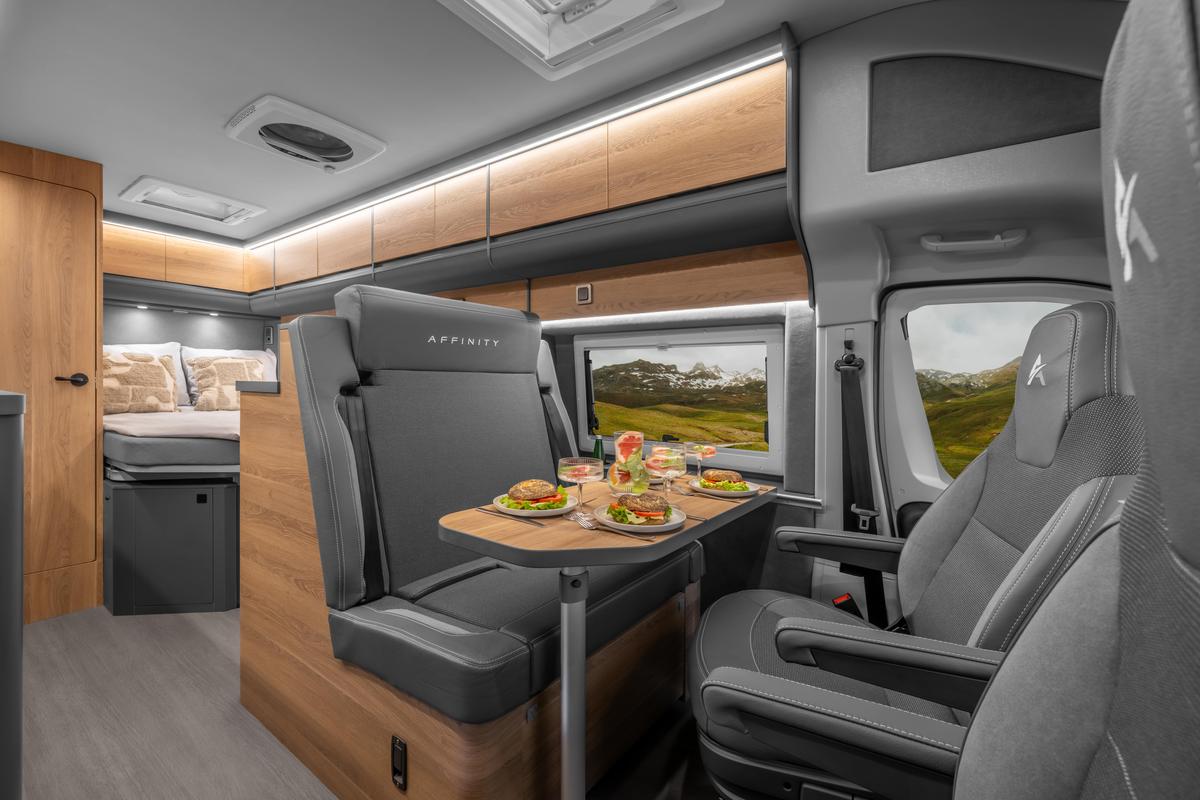 Široké a pohodlné posuvné dvere vedú do priestranného interiéru karavanu. Všetko od skriniek a skríň až po technické vybavenie je ľahko dostupné. Kuchyňa v tvare písmena L s veľkou pracovnou doskou, integrovaným sprchovacím kútom, útulnými jedálenskými a spálňovými priestormi robia z Affinity One skutočne pohodlné obytné auto.