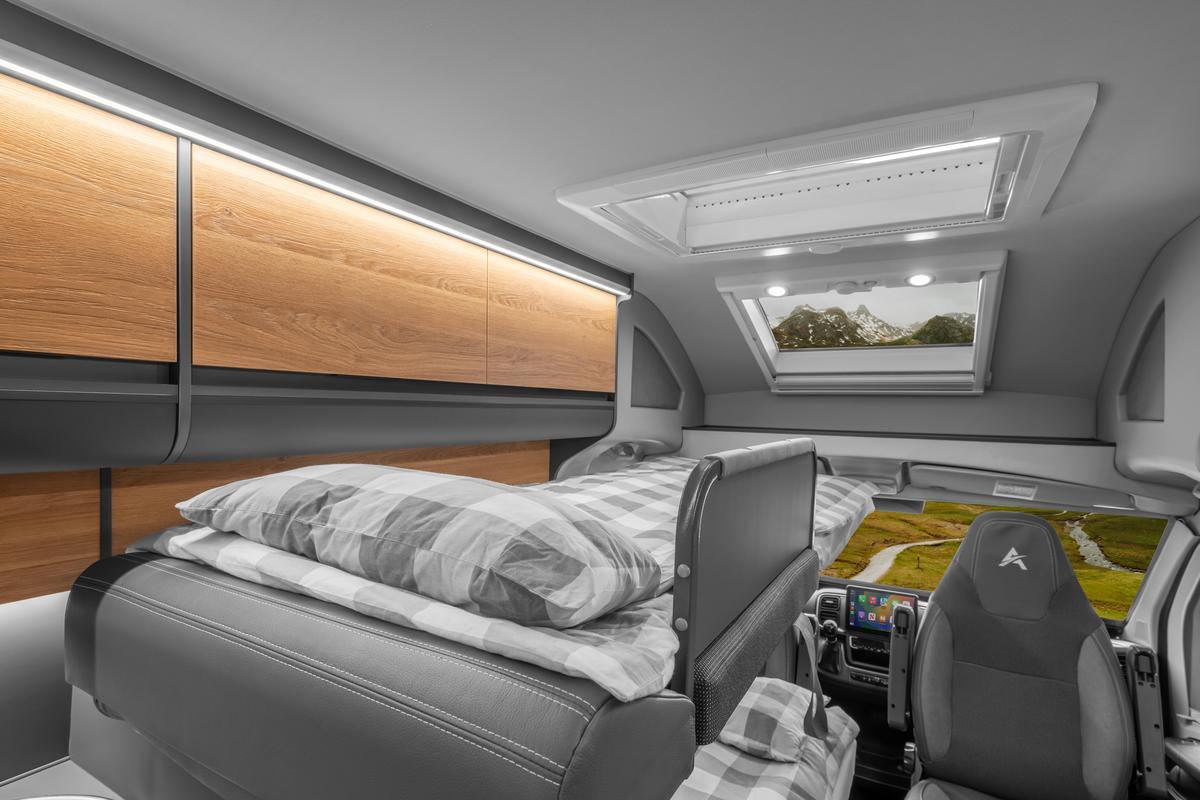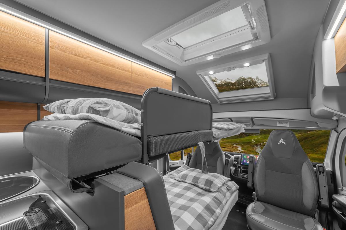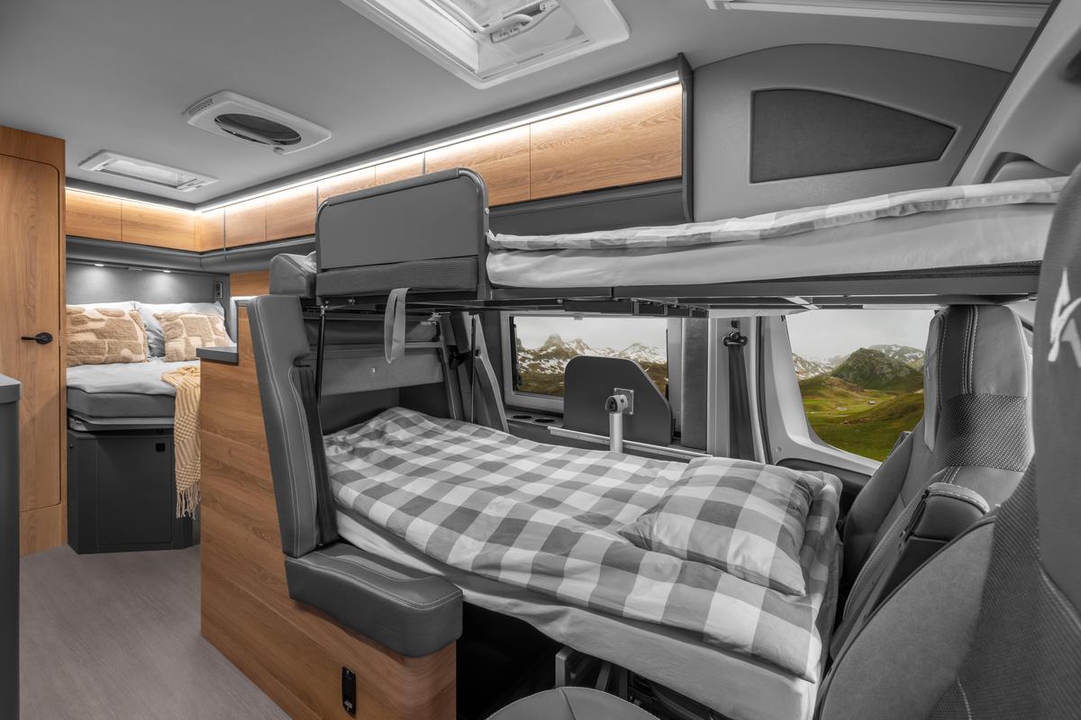 Namontovať postele pre štyri osoby do takéhoto veľkého vozidla je pomerne náročná úloha, pretože si vyžaduje inovatívny prístup a nevšedné nápady. Affinity One disponuje až štyrmi pohodlnými lôžkami: veľkou francúzskou manželskou posteľou v zadnej časti a jedinečnou skladacou poschodovou posteľou v prednej časti.
