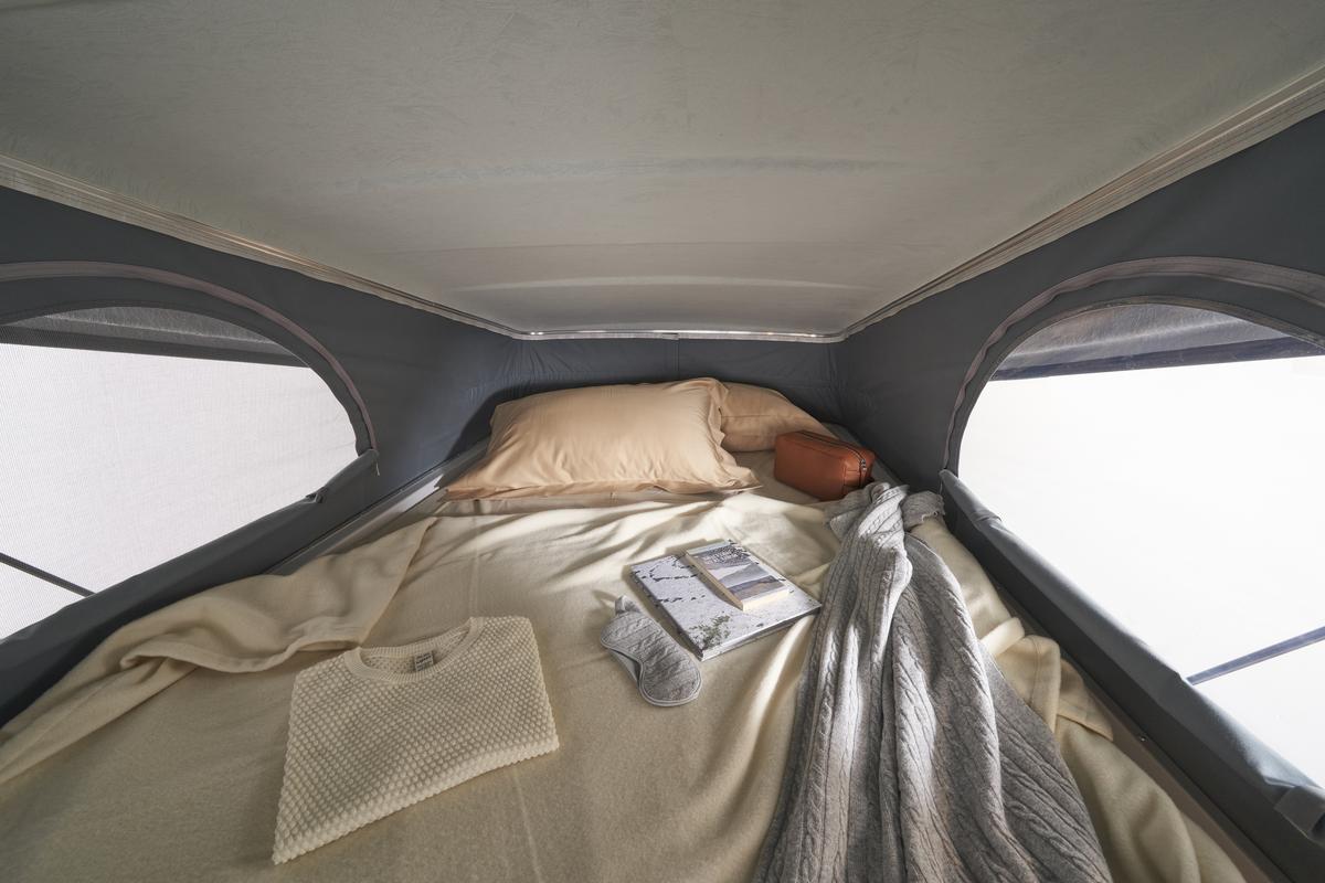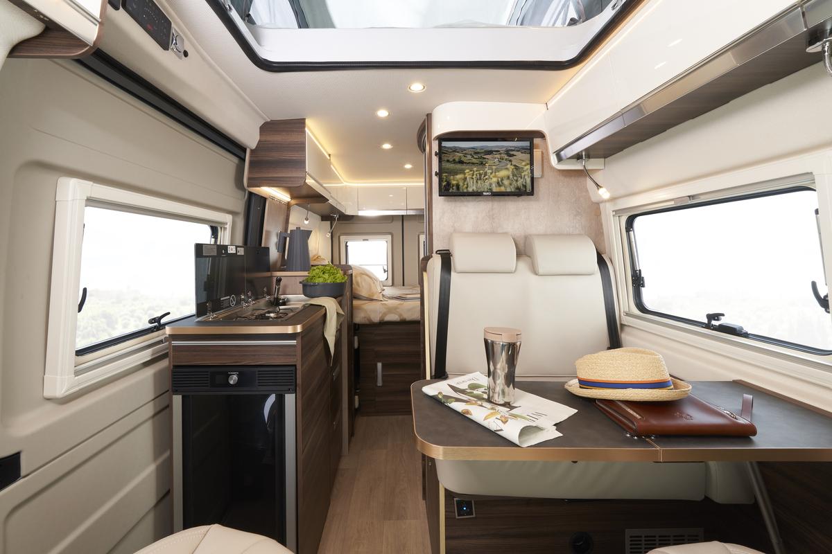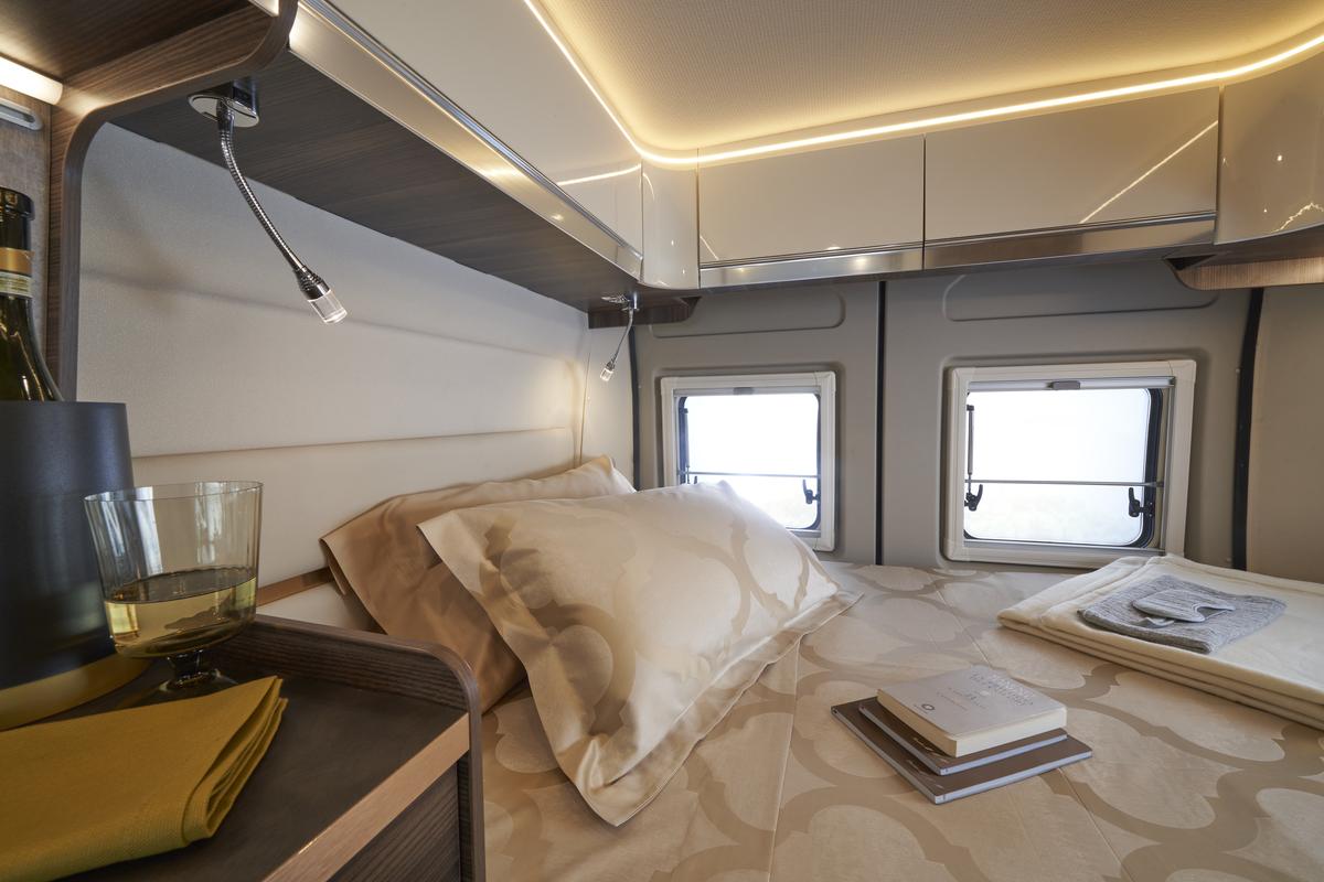 Jedinečný pocit priestoru vďaka zvýšenej vnútornej výške v kabíne a nad obytnou časťou; Izolovaný a čalúnený strop; Zadné lôžko je možné jednoducho demontovať pre naloženie mimoriadne objemných predmetov; Maxi panoramatické strešné okno nad obytnou časťou.