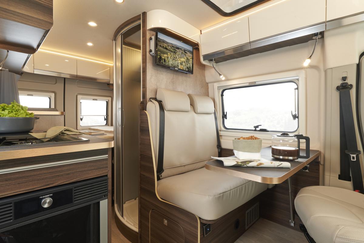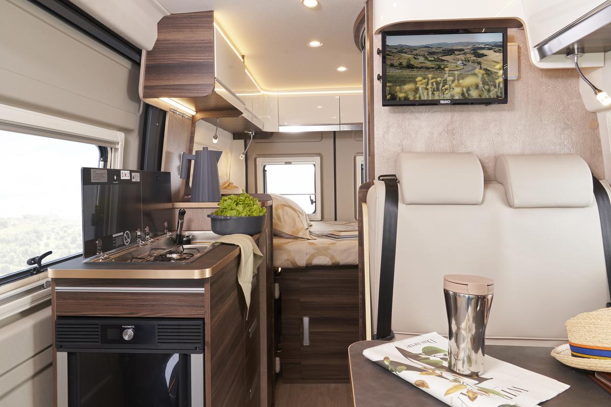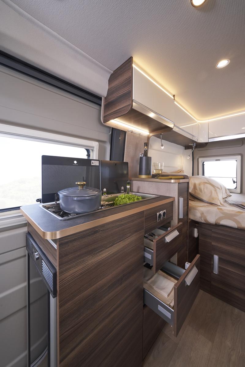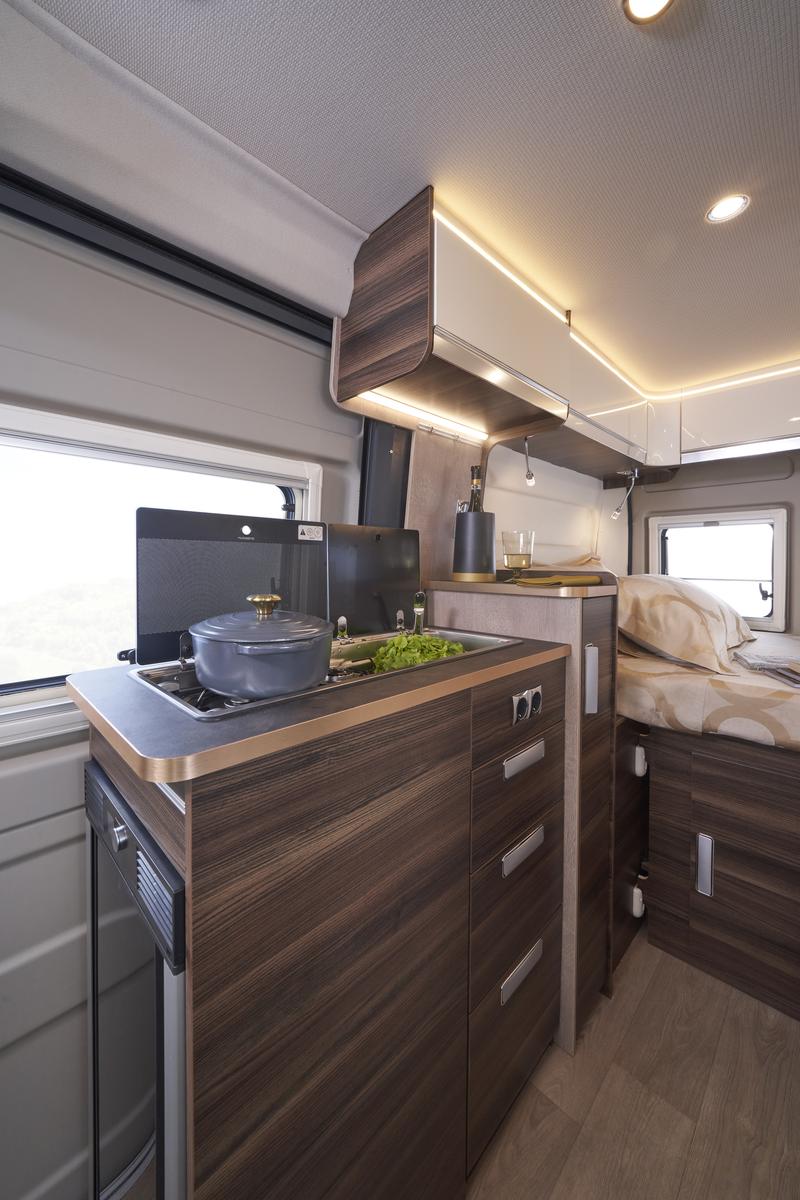 Jedinečný pocit priestoru vďaka zvýšenej vnútornej výške v kabíne a nad obytnou časťou; Izolovaný a čalúnený strop; Zadné lôžko je možné jednoducho demontovať pre naloženie mimoriadne objemných predmetov; Maxi panoramatické strešné okno nad obytnou časťou.