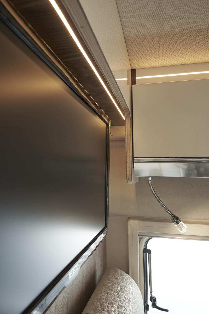 Úložné priestory a nepriame osvetlenie v prednej časti; Ergonomické vankúše v obytnej časti s odnímateľnými poťahmi – sedáky, operadlá a dekoračné vankúše je možné usporiadať podľa potreby; Dizajnové čelo zadnej postele.