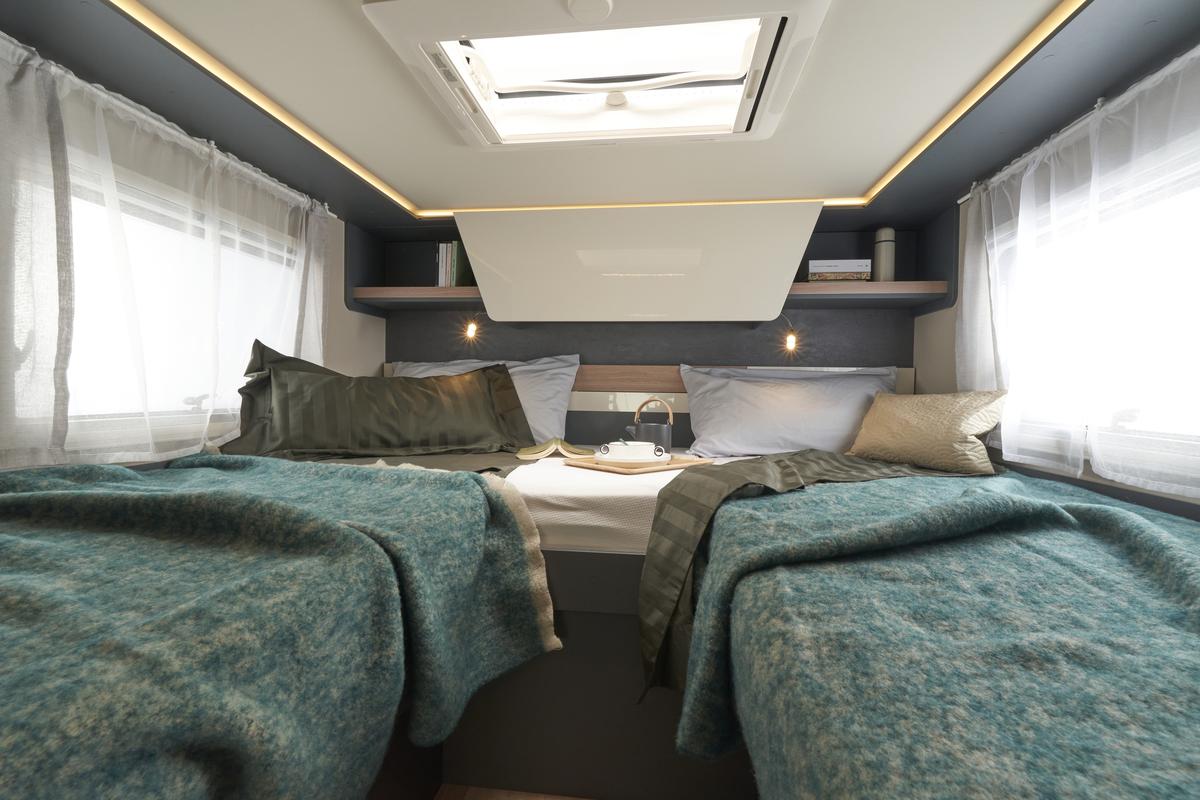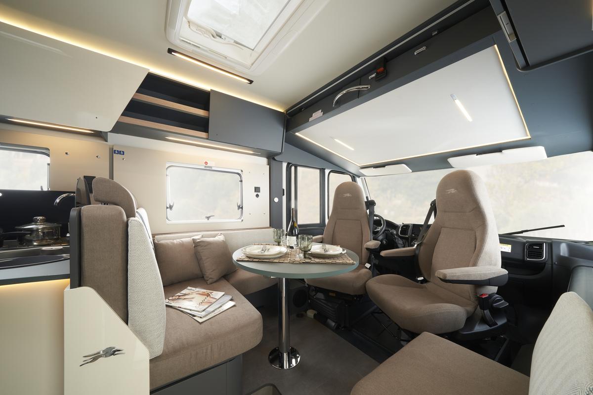 Interiér a komfort: Izolovaný a čalúnený strop; Optimalizovaná konštrukcia nábytku s antikondenzačným účinkom; Výškovo nastaviteľné opierky hlavy na sedadlách v jedálenskej časti; Čalúnenie sedadiel s odnímateľnými poťahmi; Jedálenský stôl s jednoducho ovládaným posunom; Lamelové rošty postelí; Komfortné matrace so strečovou podšívkou, ktorá sa môže prať v práčke; Šatníková skrinka s výsuvnou tyčou; Skrinka na LED TV (až 32“); Závesom oddelená spálňa.