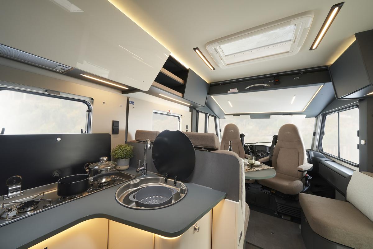 Kuchyňa: Pracovná doska a jedálenský stôl odolné proti poškriabaniu (Fenix®); Kuchynský nábytok s jemným zatváraním; Nepriame osvetlenie pod kuchynskou linkou; Strešné okno 40 x 40 cm v kuchni; Nerezový drez; Varná doska s 3 horákmi; Absorpčná chladnička 136 l s automatickým výberom zdroja napájania (AES); Zásuvka 230 V v kuchyni; Sklenená ochrana stien na linke; Kovové vodovodné batérie.