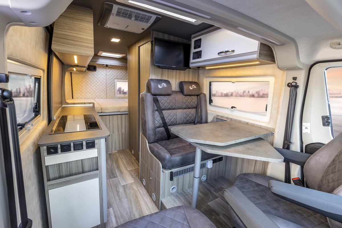 Interiér s kvalitným textilným čalúnením dverí, stropu a sedadiel – bez tvrdých plastov, s kompletnou 4-season izoláciou (steny, zadné dvere, posuvné dvere, podlaha).