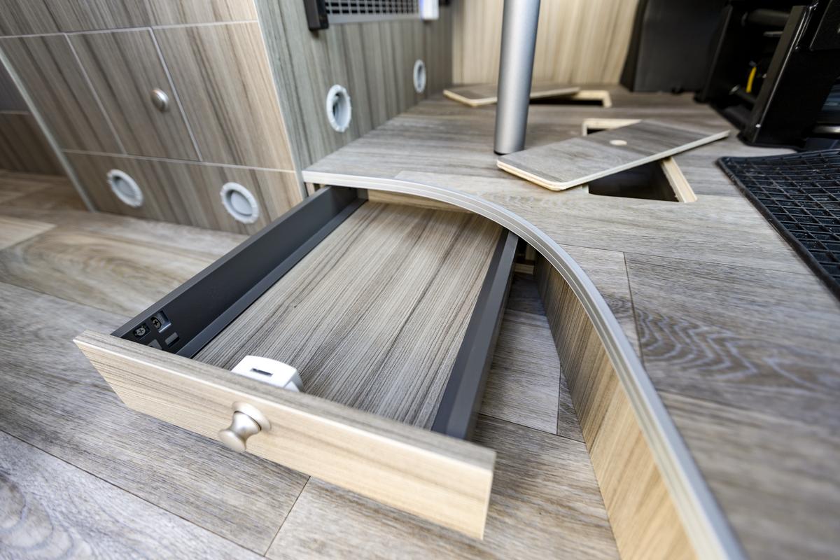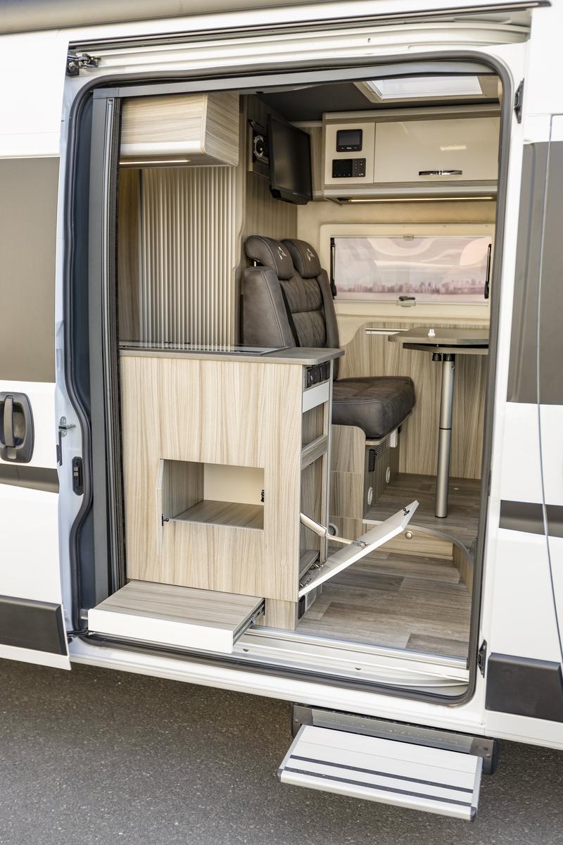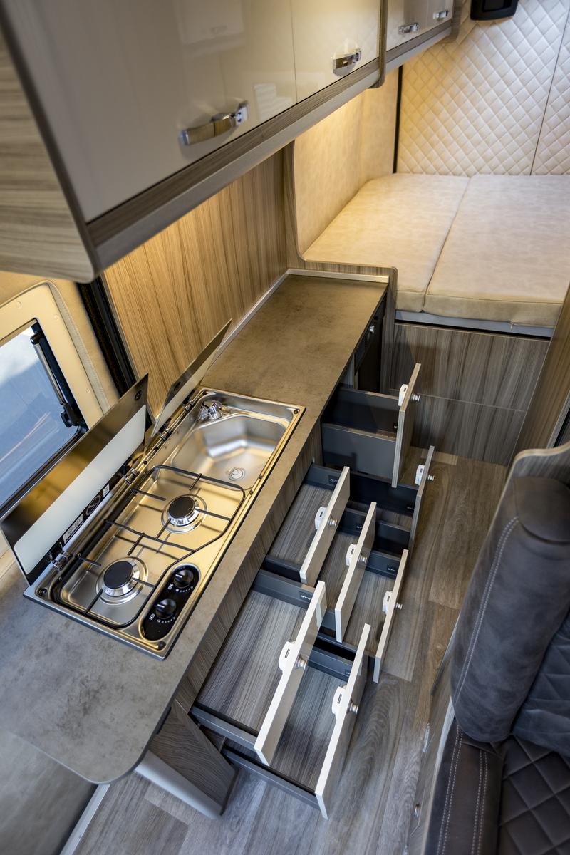 Dvojhoráková varná doska s piezo-zapaľovaním a krytom z tvrdeného skla, výsuv pracovnej plochy, zásuvky s plnovýsuvom, dve dodatočné skrinky s výsuvmi, integrovaný odpadkový priestor (prístupný zvonka aj zvnútra), kompresorová chladnička s mrazničkou (v originále Thetford / Dometic).