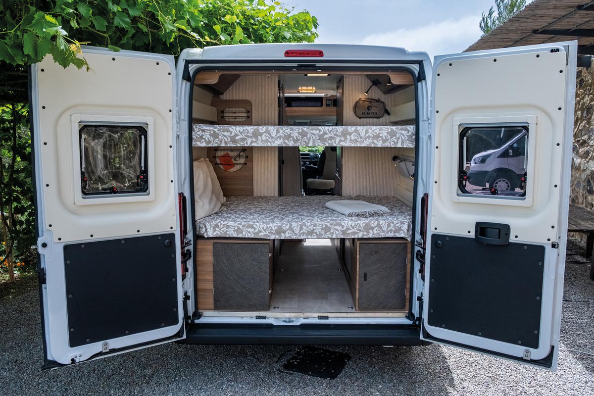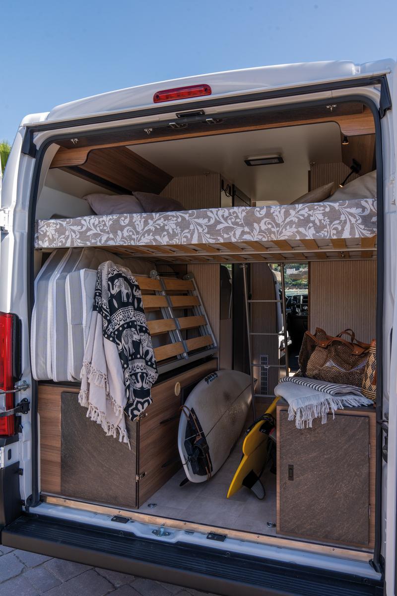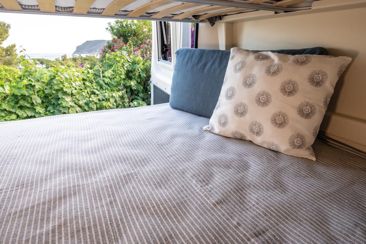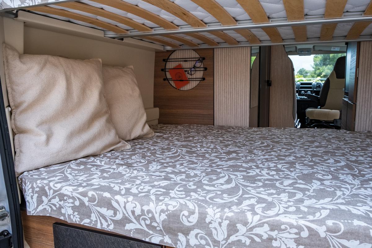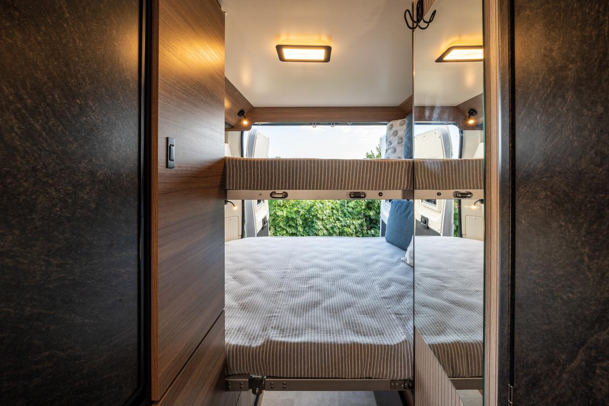 Lôžka: zadné poschodové dvojlôžka (horné úplne odnímateľné): 1,35 x 1,85 m, rozkladacie lôžko (stredová jedálenská časť): 1,15 x 1,82 m.